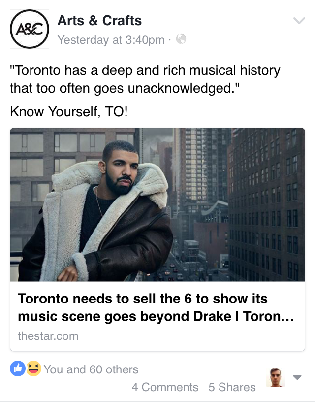 Social media post that I pitched to my supervisor, who gave it the greenlight. My strategy with this one was that we could generate more interactions on our social media if we appealed to Torontonians new found sense of civic pride, and the linked article's discussion about Arts & Crafts position within the history of Toronto music helps fortify in people's minds the idea that the label is an historic, integral part of the musical and cultural tapestry of Toronto. Yes, I liked the post from my personal account. It was my first pitch I got greenlit and I was proud, what of it!